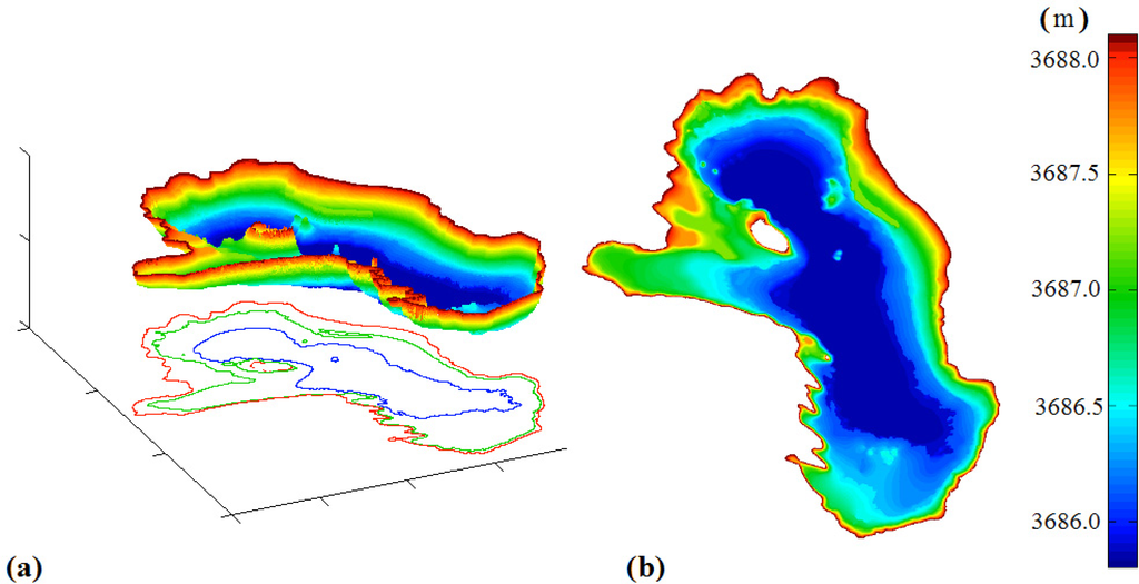 The bathymetry reconstruction was performed with Matlab functions: TriScatteredInterp function [47], allowing interpolation on a regular grid from irregularly scattered points, and MeshGrid function for grid meshing [48]. A 5 × 5 pixel median filter was applied to smooth irregularities and remove artifacts. The bathymetry keeps the same pixel size as input Landsat images. For the purposes of comparison, Lake Poopó hypsometry is estimated directly from bathymetry using Heron’s formula [8]. The methodology presented above allowed us to calculate the Lake Poopo bathymetry and water storage variations as shown in the following section.