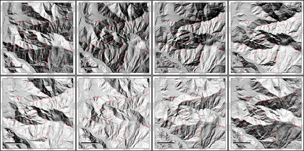 Shading map of KSDF007 debris flow torrent area in eight different aspects with azimuth of: 45°, 90°, 135°, 180°, 225°, 270°, 315°, and 360°, from left to right as well as up and down.