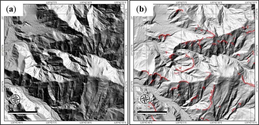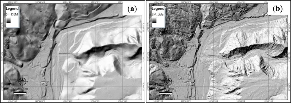 The digital elevation model represents topographic relief and ground elevation. A Lidar survey with the resolution of 2 m × 2 m was carried out in the study area after Typhoon Morakot occurred by the Soil and Water Conservation Bureau (SWCB) in 2010 with the average point cloud density of 2 /m2 in plane area and 0.5 /m2 in the mountain area. The 2 m × 2 m DEM was used to detect the geomorphologic features of large-scale landslides, including scarps, scars, cracks, and other related linear structures. Different resolution DEMs have been compared as shown in Figure 9. The 5 m resolution DEM of the downstream area of Nachilan River is shown in Figure 9a, and the 2 m resolution DEM of the same area is shown in Figure 9b. Since the high resolution DEM is more helpful in locating the topographic features, such as the linear structures, the 2 m resolution Lidar data produced by the SWCB were used in this study.
