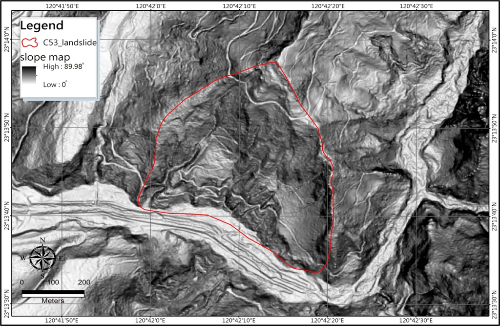 Due to the fragile geologic structures and steep terrains, the heavy rainfall carried by typhoons often causes landslide and debris flow in Taiwan. In 2009, Typhoon Morakot struck Southern Taiwan, dumping more than 3,000 mm of accumulated rainfall on to the land. The large-scale landslide (landslide area larger than 10 ha) that occurred in the Shiaolin Area (Figure 1 [1,2]) affected an area of more than 270 ha and resulted in approximately 500 casualties. The landslide also caused the damming of the Chishan River, and the consequent flooding of the upward valley. Similarly, other large-scale landslides were observed in both the Chishan and the Laonong River watersheds. These landslides that occurred upstream of the debris flow torrents often contributed to debris transport, thereby increasing debris flow, and causing severe hazards and secondary hazards such as landslide dam and dam burst, or further debris transportation in subsequent rainfall events. An example of a large-scale landslide near the Tai-27Jia Highway next to the Laonong River is shown in Figure 2, where its head scarp can be easily identified. Thus, investigation and identification of potential large-scale landslides is crucial for hazard reduction.
