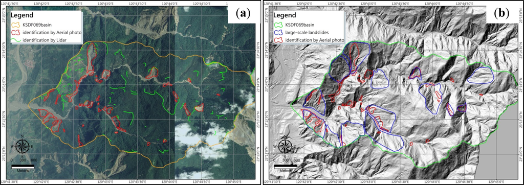 Comparisons of landslides mapped using Lidar information and aerial photos in KSDF069 debris flow torrent basin: (a) aerial photo with mapped landslide and scars by Lidar, (b) Lidar shading map with landslides from aerial photo and large-scale landslide.