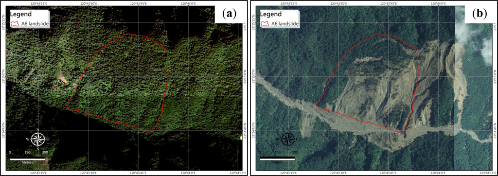 The A6 landslide is a type A landslide triggered by Typhoon Morakot. The affected area is approximately 49.65 ha, with an average slope angle of 30.5°. The Formosa-2 satellite image (with a resolution of 2 m) before Typhoon Morakot in 2008 and aerial photo after Typhoon Morakot are shown in Figure 17. Comparison of the images indicates that the large-scale landslide can be clearly observed, as can the widened and flooded river channel filled by debris. Part of the landslide body appears to have slid down-slope, causing it to be eroded by the channel flow. Large portions of the landslide mass remain on site, with potential to move further down-slope, making the A6 landslide a particular area of interest for further detailed study.