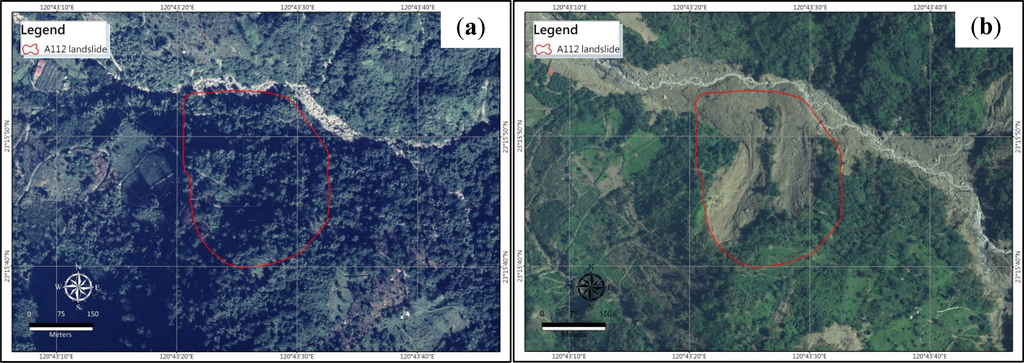Aerial photos of the A112 landslide: (a) before Typhoon Morakot, (b) after Typhoon Morakot.