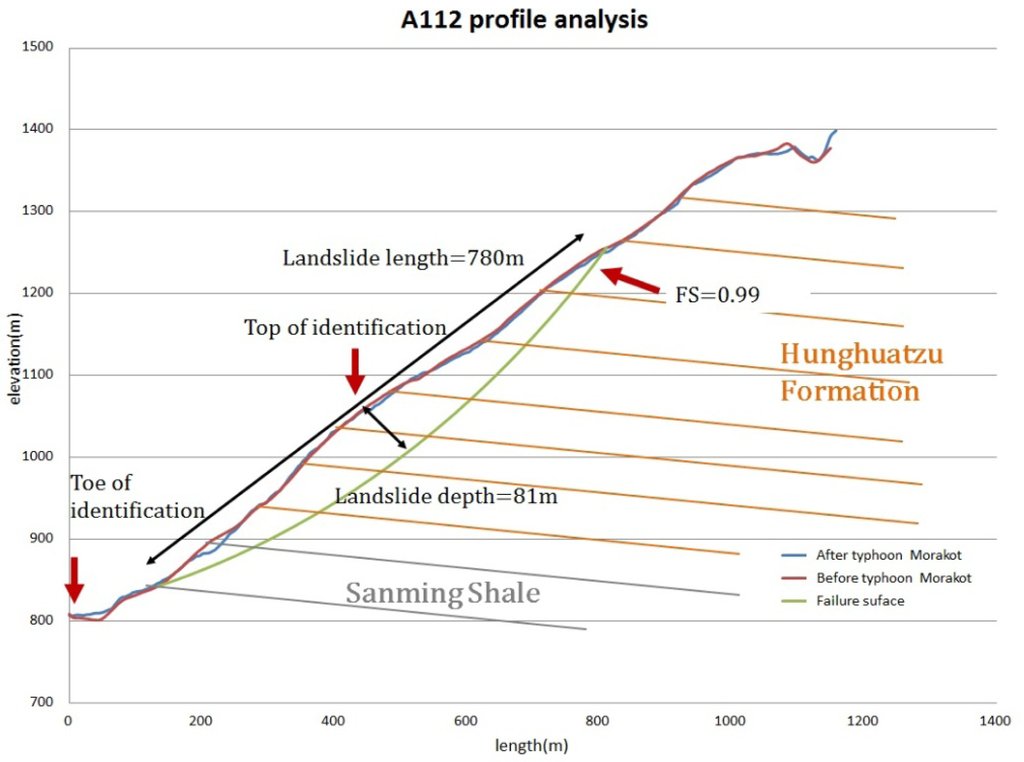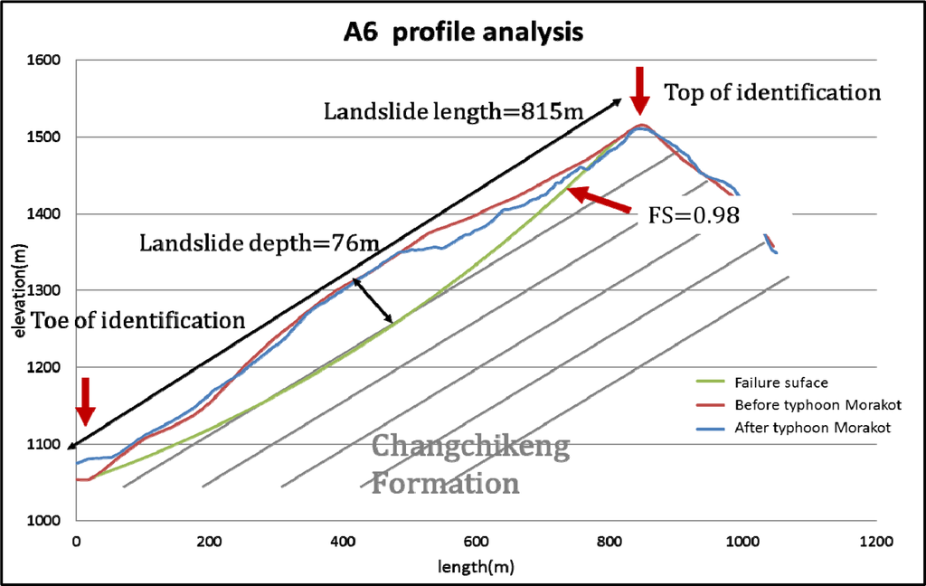 Stability analysis of the A6 landslide was conducted to verify the failure condition, and the location of the critical failure surface was compared to the slope profile variation after the Typhoon Morakot. The geotechnical parameters were referred to data of similar geological formations (Lin et al. [13]), and after back analysis, the parameters used were: unit weight of 23.5 kN/m3, ground water table reached the top of available gullies and near the ground surface, cohesion of 50 kPa, and a friction angle of 26 degrees. The corresponding safety factor with these parameters was 0.98. The resulting critical sliding surface is plotted against the slope profiles before and after Typhoon Morakot in Figure 23. The differences between the original slope profile and profile after Typhoon Morakot provide information on the locations of head scarp, scars of possible sliding surface, and bulging or deposition near down-slope. The critical sliding surface determined from the back analysis fits the location of linear structure/scars and the topographic variations well at the crest and toe as shown in Figure 23. The head scarp of the critical sliding surface is located in close proximity to the edge of the slope and matches the scarp of the profile after Typhoon Morakot. The stability analysis provides cross validation of the mapped large-scale landslide, and the critical sliding surface can be used to check the possibility of failure occurrence and estimation of the landslide volume and amount of remaining unstable materials.