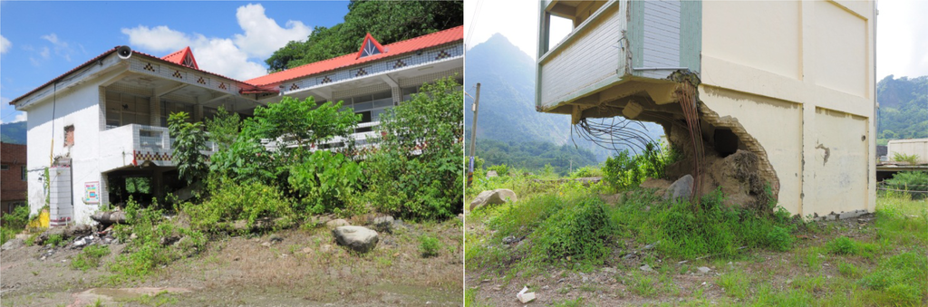 Damage of an elementary school (left) and a resident’s home (right) caused by debris flow affecting torrent KSDF007 in Nansalu Village, Kaohsiung City.