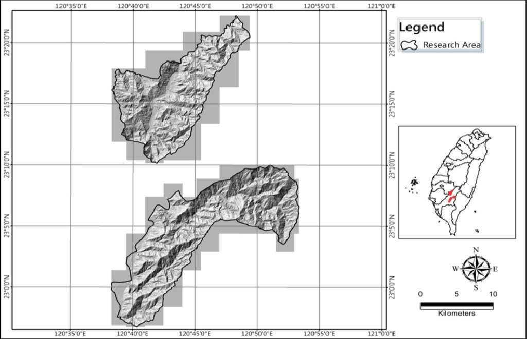 The geographic location and digital topographic map of the Namasha and Liuoguey areas are illustrated in Figure 5. In the figure, the northwest part represents the Namasha area and the southeast part represents the Liuoguey area, both of which are located in Kaohsiung City.