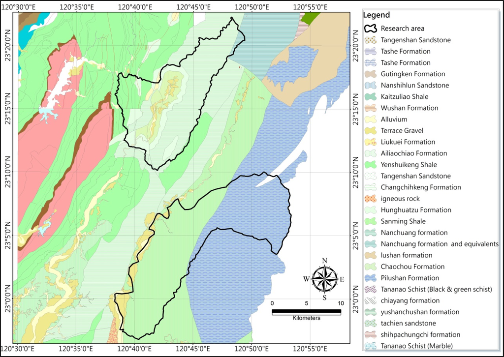 The geological map of the two areas is illustrated in Figure 6 ([7,8]). The Namasha research area is in the Western Foothills Zone according to engineering geology classification in Taiwan, which is mainly composed of un-metamorphic rock of the Miocene with sandstone, siltstone, shale, and sandstone/shale interlayer formations. The engineering geology classification of the Liuoguey research area is located in the Central Mountain Range Zone, and the stratum is meta-argillite and meta-shale of the Tertiary epoch with mostly slate formations [9].
