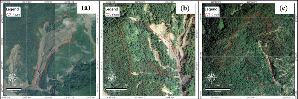Type A landslide is the newly occurred landslide, or current event, displaying significant geomorphologic evidences, clear scarps, and usually exposed bare land. Since the type A landslide has already occurred, if not much residual sliding mass remains on the slope, then the landslide will be less likely to recur in the near future. Figure 8a is an example of type A landslide in the tributary of the Baolai River in Liuoguey area. Type B is the landslide that previously occurred, or prior event, showing clear geomorphologic evidences, but with no significant scarps. The type B landslide had some vegetation recovery differing from its surrounding area, which suggested a period of within a decade. Figure 8b is an example of type B in the Taoyuan District of Liuoguey area, noted the differences in vegetation of landslide area and neighbouring area. Type C is landslide with geomorphologic evidences and no clear signs of reactivation. This type is usually identified with geomorphologic features, including scars, side cracks, and linear structures near the crown, etc. Figure 8c is an example of type C in the Taoyuan District of Liuoguey area with features of some scars, erosion gullies, and swelling toe. Finally, type D is an area without geomorphologic evidence, but with geological settings like dip slope, joint and altitude suggesting the possible presence of a landslide. The type D is usually mapped according to correlation of the geological setting with respect to the topography of the slope, and is not discussed in this study.