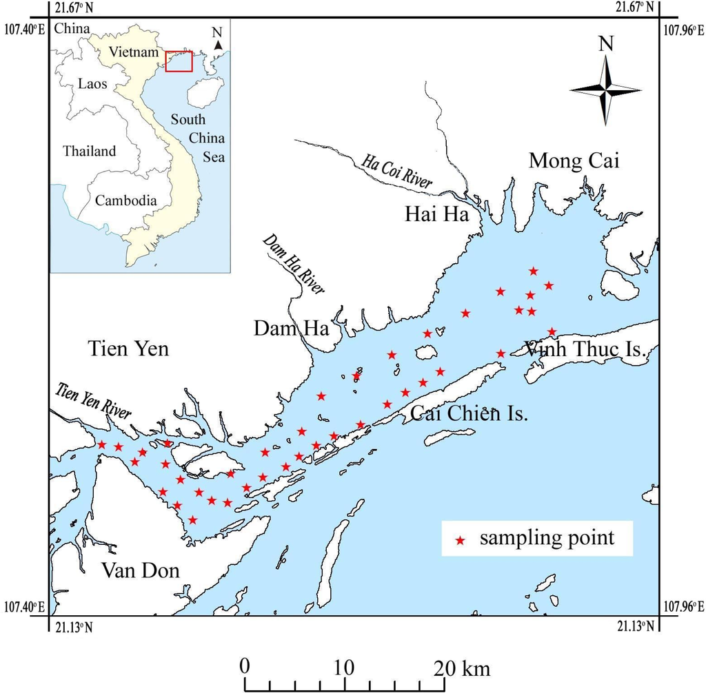 Tien Yen Bay, adjacent to both Vietnam and China, covers an area of approximately 400 km2 and is connected to the South China Sea by five channels (Figure 1). The most remarkable feature of the bay is its shallowness: the sea depth generally ranges from 2 to 5 m; although it becomes deeper in the connecting channels, the maximum depth is still only 20 m. There are five short local rivers that usually transport small quantities of freshwater (the average water discharges of Tien Yen River and Ha Coi River are 22.1 and 7.4 m3/s, respectively) and sediments into the bay. The sediment quantity decreases further in the dry season to 4 mg/L of the total suspended solids. Therefore, the physical and aquatic environment of the bay is a typical closed sea environment, which is influenced mainly by oceanographic factors, such as tide, waves and near-shore currents.