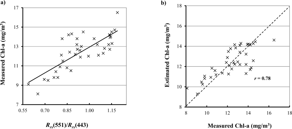 (a) The relationship between chlorophyll-a (Chl-a) concentration of the water sample and the ratio of two reflectances at MODIS Band 12 (551 nm) vs. Band 9 (443 nm). A regression line is drawn to show the relationship. (b) Scattergram of Chl-a concentrations between the sample value and estimation by the ratio of green and blue band reflectance (rGBr) of Equation (17). The 45-degree dotted line denotes perfect estimation.