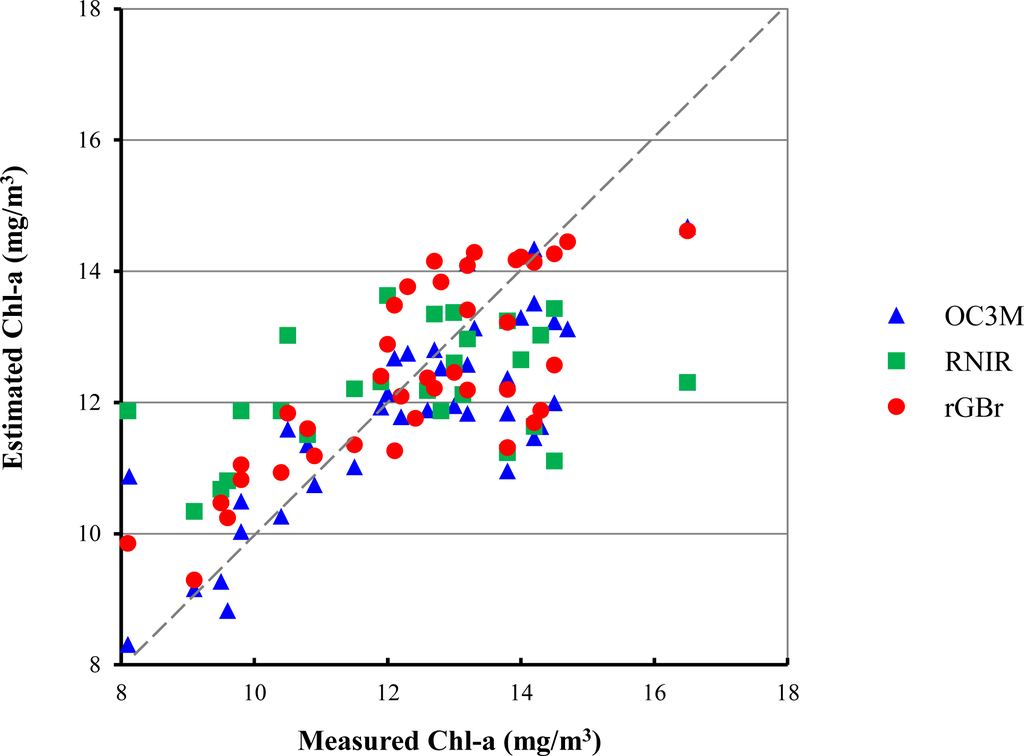 The capabilities of the three models can be evaluated, as seen in Figure 3, which shows the relationship between the measured and estimated Chl-a concentrations. As estimated from the r value, this relationship is the weakest in RNIR: in particular, the high and low concentrations cannot be estimated. This result proves the overestimation problem of RNIR for the waters containing Chl-a ≥ 6 mg/m3 by Gilerson et al. [40]. The difference between OC3M and rGBr is remarkable in the region with concentrations higher than 14 mg/m3, in which the trend of the underestimate is stronger in OC3M than rGBr. Consequently, rGBr was identified as the best model for estimating Chl-a concentrations over Tien Yen Bay with small errors.