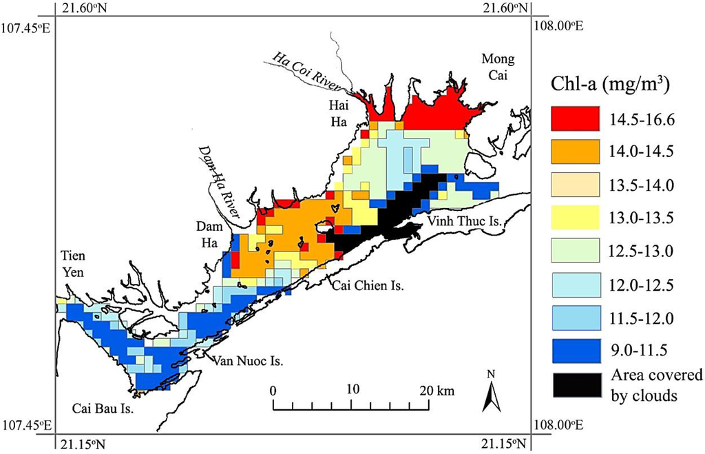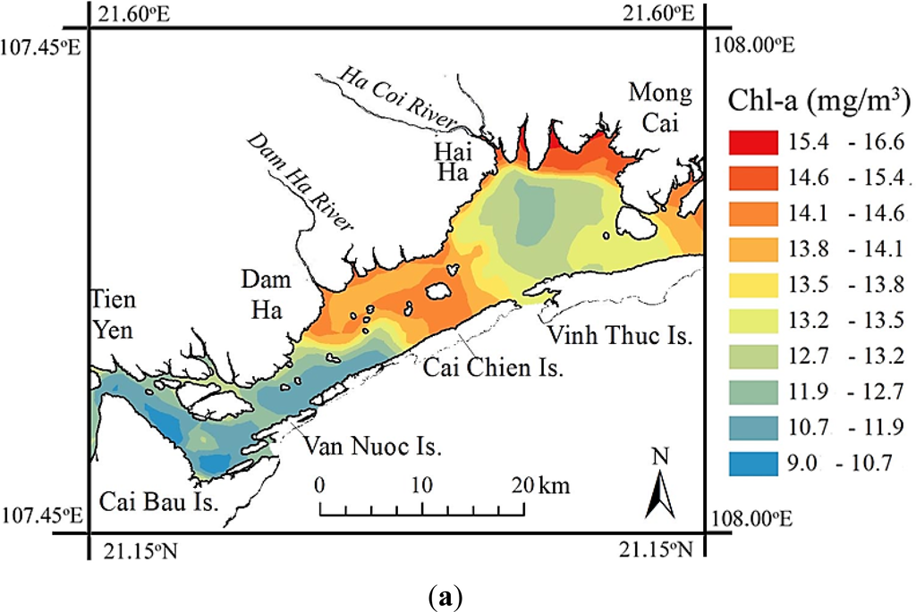 Note that the remote sensing technique can detect Chl-a in surface waters only. However, Tien Yen Bay is a shallow water body; then, Chl-a concentrations may be relatively uniform over the depth except for the deep channels [28]. Phytoplankton, such as diatoms (Bacillariophyta), is often accumulated at the highest level in the surface water layer within the 1-m depth for photosynthesis.