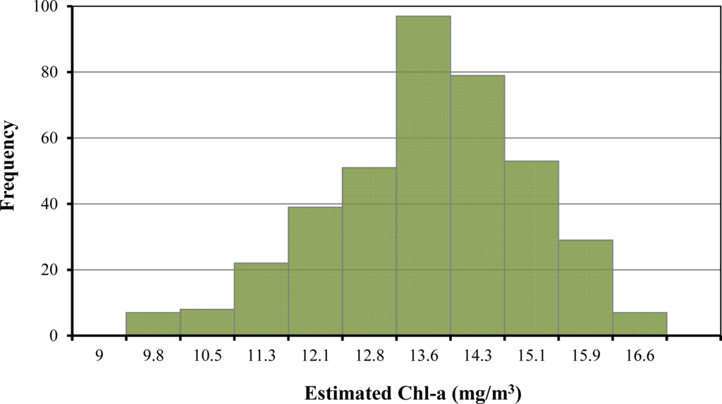 Next, the MODIS-based estimation was transformed by OK into a more precise distribution with a 100-m grid. Usually, in situ sample data are used for OK, but Chl-a concentrations cannot be estimated on the day without sample data by this usual procedure. Instead, estimates of Chl-a concentrations using only MODIS image data enable Chl-a monitoring on the image acquisition day. The histogram of the 392 Chl-a concentration data is not far from a normal distribution (Figure 5). Therefore, this dataset is suitable for geostatistical analyses that require normal distribution of regionalized random variables as OK.
