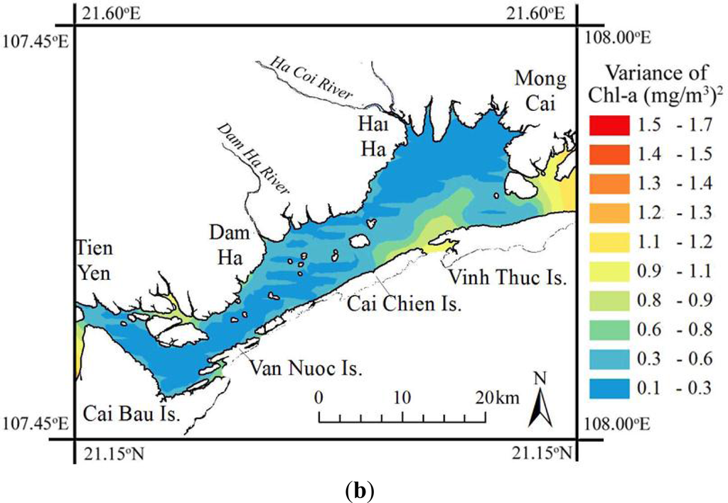 The OK map in Figure 7 presents much more precise spatial characteristics than the original CChla distribution in Figure 4 and also clarifies the eutrophic conditions in the waters of Tien Yen Bay. The Chl-a concentrations on 6 July 2010, ranged from nine to 16.6 mg/m3, which are four to 7.5 times of the eutrophic level, 2.21 mg/m3 [71:Table 4]. Generally, concentrations of Chl-a over 14.5 mg/m3 occur in local estuaries at the mouths of the Ha Coi and Dam Ha Rivers and along the coast from Mong Cai to Hai Ha. The middle bay also contains high Chl-a from 13.5 to 14.5 mg/m3 from Cai Chien to Hai Ha districts. On the contrary, the concentrations become low toward the west near Cai Bau Island, with a minimum of 9 mg/m3 in the channels connected with the outer sea.