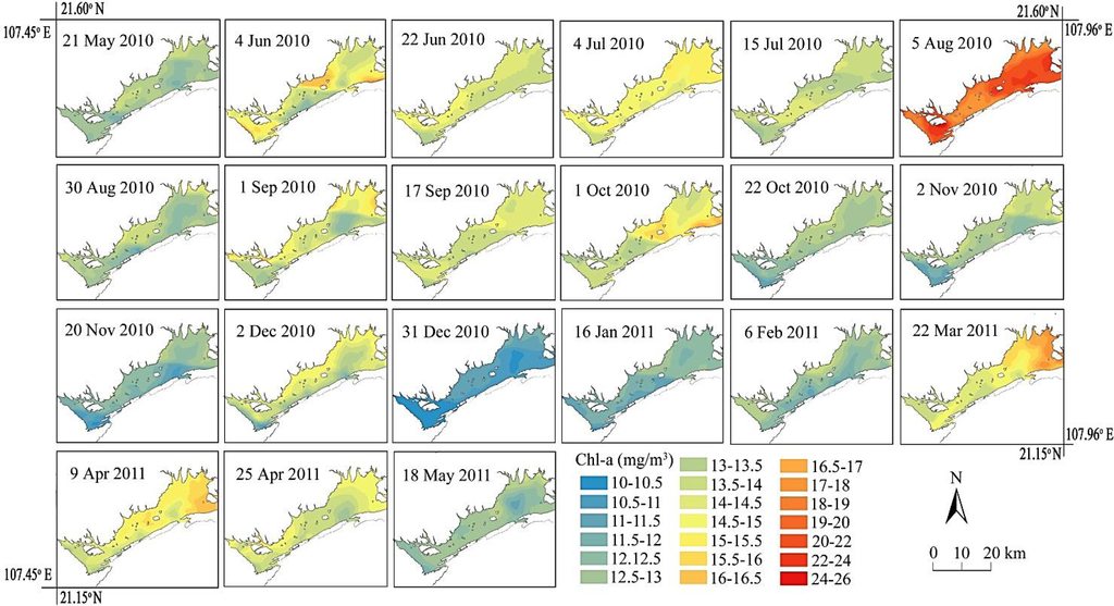 To clarify the eutrophication process and the seasonal change of Chl-a concentrations in the waters of Tien Yen Bay, the rGBr and OK were applied to 21 scenes of MODIS image data that were acquired under the lowest cloud coverage conditions from late May 2010, to middle May 2011. The resultant maps are shown in Figure 8. The general trend of the Chl-a concentrations is observed to be similar to Figure 7 in that higher concentrations are located in the near shore and the central bay waters, while lower concentrations are distributed in the waters connected directly to the outer sea. The map of 5 August 2010, reveals extraordinarily high concentrations over the whole bay, which may have been caused by the massive growth of phytoplankton, due to the strong solar energy in the midsummer.