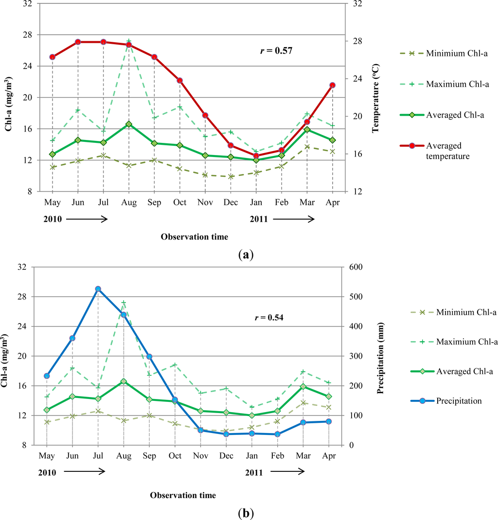 Variations of monthly averaged, maximum and minimum Chl-a concentrations over Tien Yen Bay calculated from the maps in Figure 8 and their correlations with monthly averaged air temperature (a) and monthly precipitation (b). The r values denote the correlations of the monthly averaged Chl-a concentration with those meteorological factors.