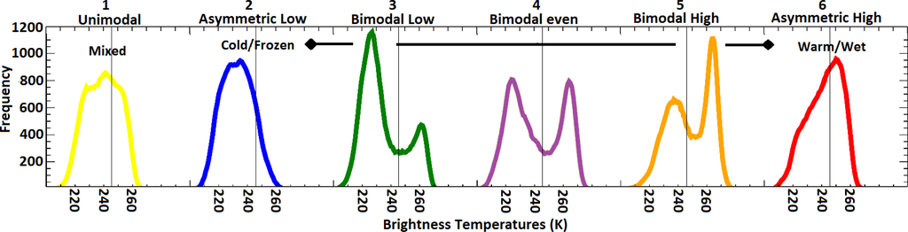 Generalization of melt regime pattern determined from the sum of annual brightness temperature histograms. Warm/wet pixels exhibit an asymmetric high distribution skewed to the right (#6; red curve); in contrast, cold/frozen pixels exhibit the asymmetric low distribution skewed left (#2; blue curve). Pixels that are cold/frozen a large portion of the year but also have some melt exhibit bimodal low distribution (#3; green curve) while ones that have more days of melt have a bimodal high distribution (#5; orange curve). Equal time cold/frozen and warm/wet are evenly bimodal (#4; purple curve). Pixels with mixed or water signals usually close to the coast are unimodal (#1; yellow curve). The thin vertical line is the melt threshold for this sensor and wavelength (246 K) determined from previous work [20] and (in conjunction with diurnal amplitude variations, DAV) indicates when the surface starts melting.