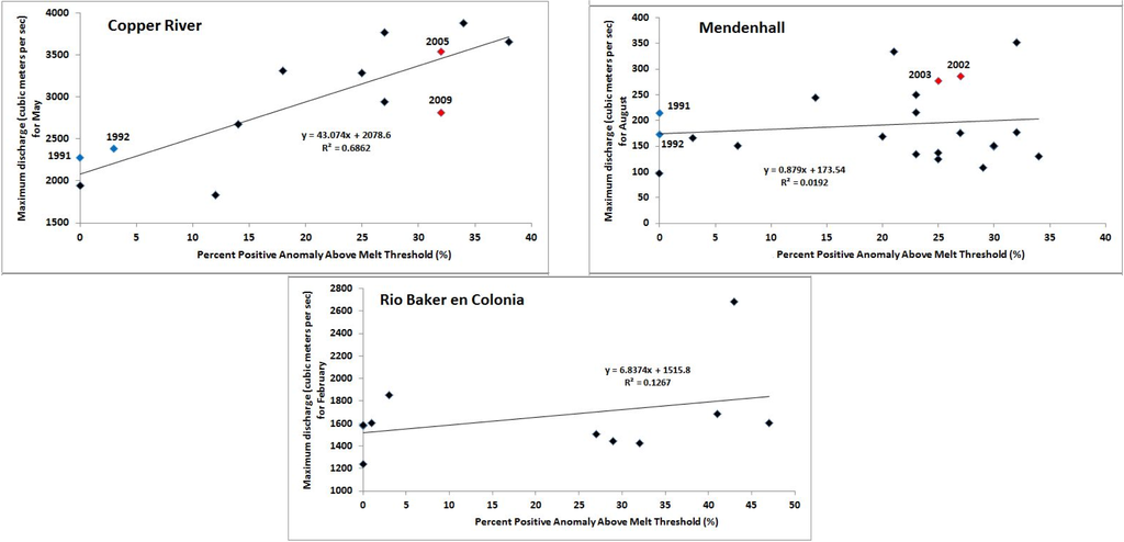 Maximum discharge (cubic meters per second) for months of typical high melt runoff (May for Copper River in Alaska, August for glacial Mendenhall River in Alaska, and February for Rio Baker in Chile) plotted against the percentage of positive anomalies above the melt threshold for that year. Linear trend lines and r-squared are shown.The high and low anomaly years illustrated in Figures 8 and 9 are labeled and colored red and blue, respectively, for Copper River and Mendenhall River.