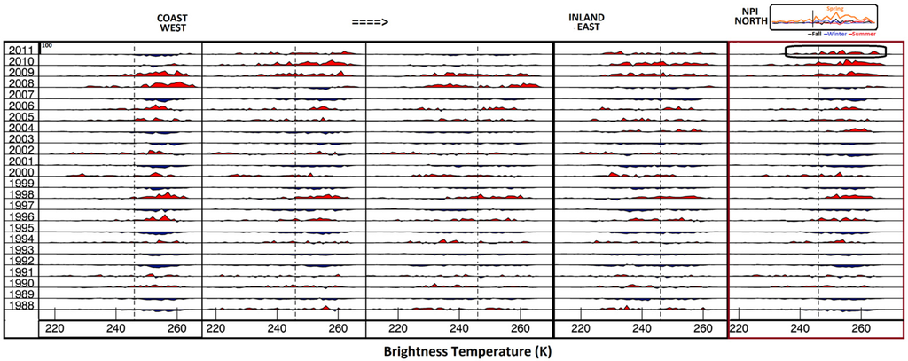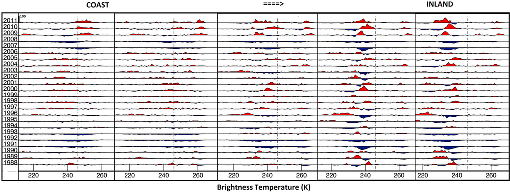Time series of Tb histogram anomalies (difference from the average of 1988–2011) for a coast to inland transect from Malaspina to Hubbard Glaciers (see the dark blue rectangle in Figure 3 for location).Red is a positive Tb deviation, blue is a negative deviation. Vertical black line in each panel is the 246 K melt threshold. For scale, the y-axis distance between each year line is 100 (this scale measures the number of occurrences of the Tb above or below the average frequency).