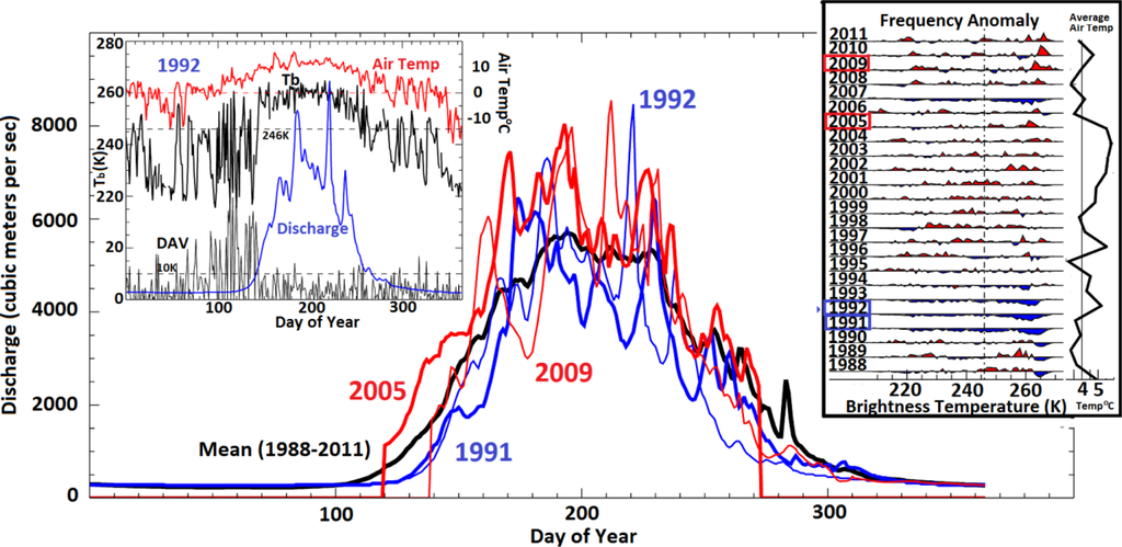 The results from these case studies highlight the tight coupling of Tb, air temperature, and discharge, and underscore the utility of monitoring melt with satellite-derived Tb. Tracking the spatial and temporal occurrence of high or low Tb anomalies may be useful for discharge, freshet, and flood monitoring.