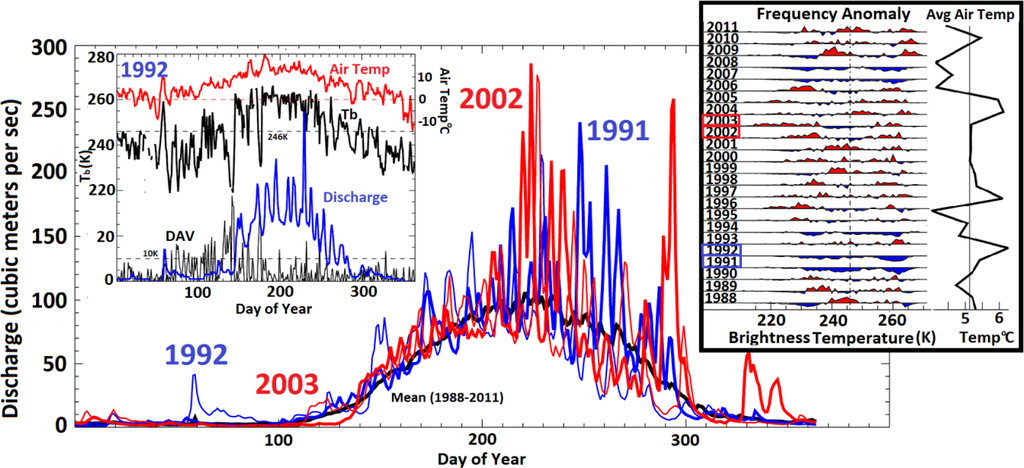 To explore the possible effects of a year with anomalous high or low Tb frequency above the melt threshold, discharge from the Copper River (near Cordova, AK) was compared to years of below average warm/wet Tbs (1991 and 1992 are shown for illustration, Figure 8) and to years of above average warm/wet Tbs (2005 and 2009 are shown for illustration, Figure 8). Figure 8 illustrates the relationship: above average warm/wet Tb years have earlier and higher discharge compared to below average warm/wet Tb years. A time series of the brightness temperature and diurnal amplitude variation (DAV) (difference between the daily ascending and descending Tbs) shows that discharge increases dramatically after the end of the high DAV or melt-refreeze period (Figure 8 inset). After this period the snowpack/glacier surface is not refreezing at night and meltwater rapidly flows downstream.