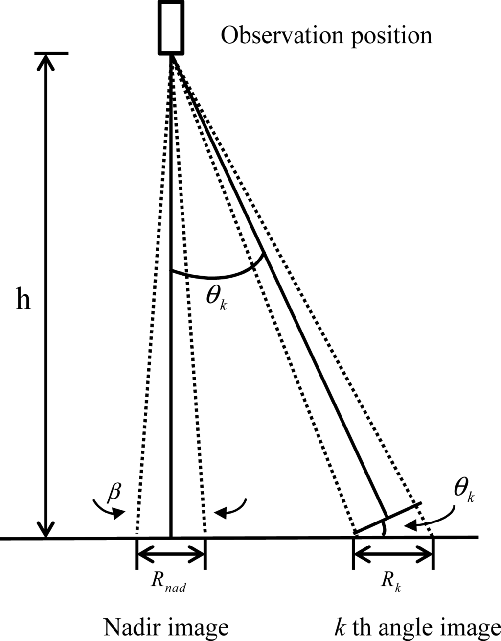 In Figure 2, β represents the instantaneous field of view angle. θk is the relative angle between the nadir image and the k-th angle image. h is the height from the sensor to the ground. Rnad represents the spatial resolution of the nadir image, and Rk denotes that of the k-th angle image. Through a series of deductions [19], the relationship between the spatial resolution of the two images can be expressed as: