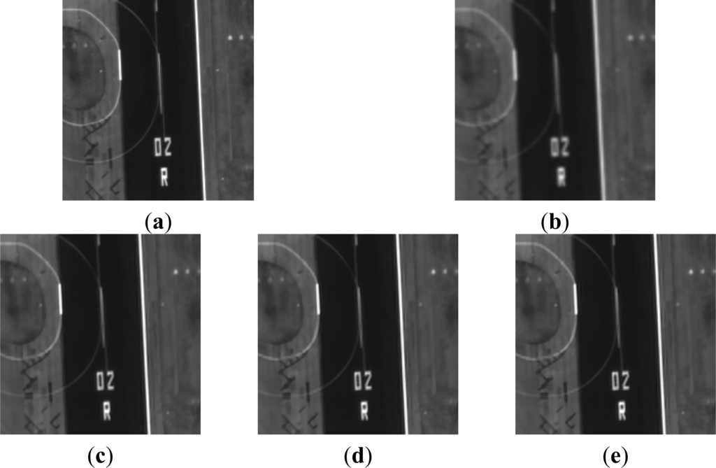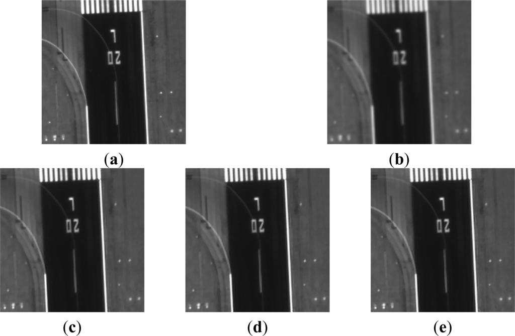 We now evaluate the multi-angle super-resolution reconstruction results of the two image sequences, which are given in Figures 6 and 7, respectively. The (a) and (b) images in Figures 6 and 7 show the original HR image and the bilinear interpolation results, respectively, and (c), (d), and (e) in Figures 6 and 7 show the results of the general SRR method (GEN), angular difference weighted SRR method (ANGW), and residual error weighted SRR method (RESW), respectively. From Figures 6 and 7, it is observed that the SRR results, both with weighting and without weighting, obtain more detailed information and better visual quality than the bilinear interpolation result. By considering the resolution differences between the different angle images, our proposed adaptive weighted SRR algorithm’s results are more similar to the original HR image than the non-weighted SRR algorithm, from the visual evaluation.