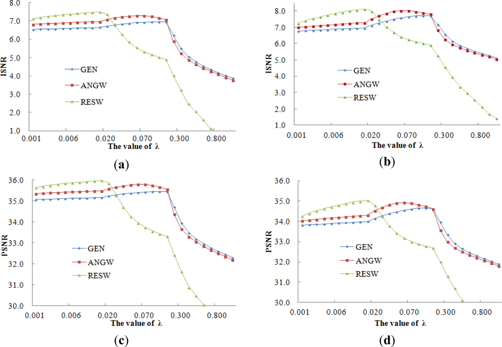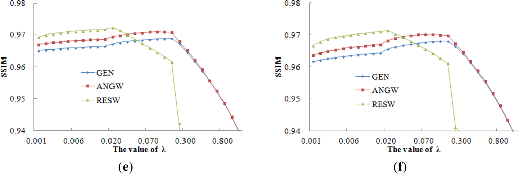 To access the sensitivity to the regularization parameter in the SRR process, the relationships between the ISNR, PSNR, and SSIM values and λ are shown in Figure 8.