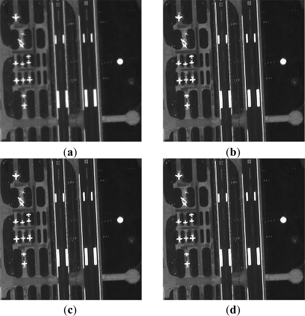 Images (a–e) in Figures 11 and 12 show the results of bilinear interpolation, the general SRR algorithm, the ANGW SRR method, and the RESW SRR method, respectively. Image (f) in Figures 11 and 12 shows the corresponding area taken from the panchromatic image as the ground truth reference. There are many detailed parts in the experimental results which can reflect the superiority of the two proposed adaptive weighted SRR methods over the general SRR algorithm. For example, images (d) and (e) in Figure 11 have richer details inside the circular flat area than Figure 11c, and the points distributed around the circle are brighter. The aircraft outlined in images (d) and (e) of Figure 12 have more sharpness and better continuity than the other results.