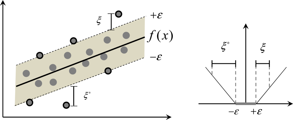 Note that the tacit assumption in Equation (2) was that such a function f(x) does actually exist and that f(x) approximates all pairs (xi, yi,) of the training set with the ε precision [58]. This optimization method using ε-insensitive loss function is the widely known ε-SVR [29], which is shown with a schematic in Figure 1. Only the points outside the shaded ε-insensitive tube are called support vectors, which are penalized, and will contribute to the optimization solution [58].
