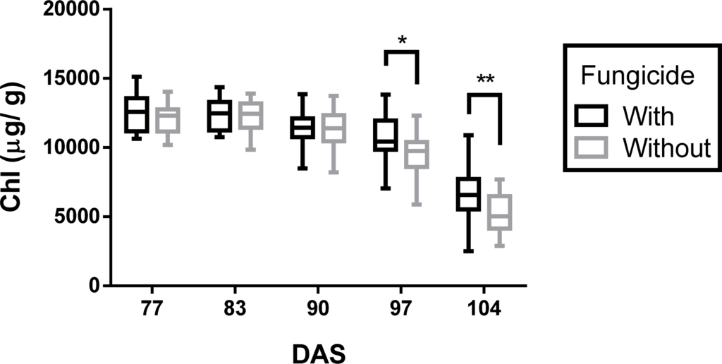 As expected, LCC was higher on the first two sampling dates (77 and 83 DAS) and decreased as plants aged, irrespective of fungicide treatments (Figure 2). Across all varieties, LCC did not show significant differences between the with- and without-fungicide treatments until the last two sampling dates (97 and 104 DAS), where the LCC was lower in the without-fungicide treatment than the with-fungicide.