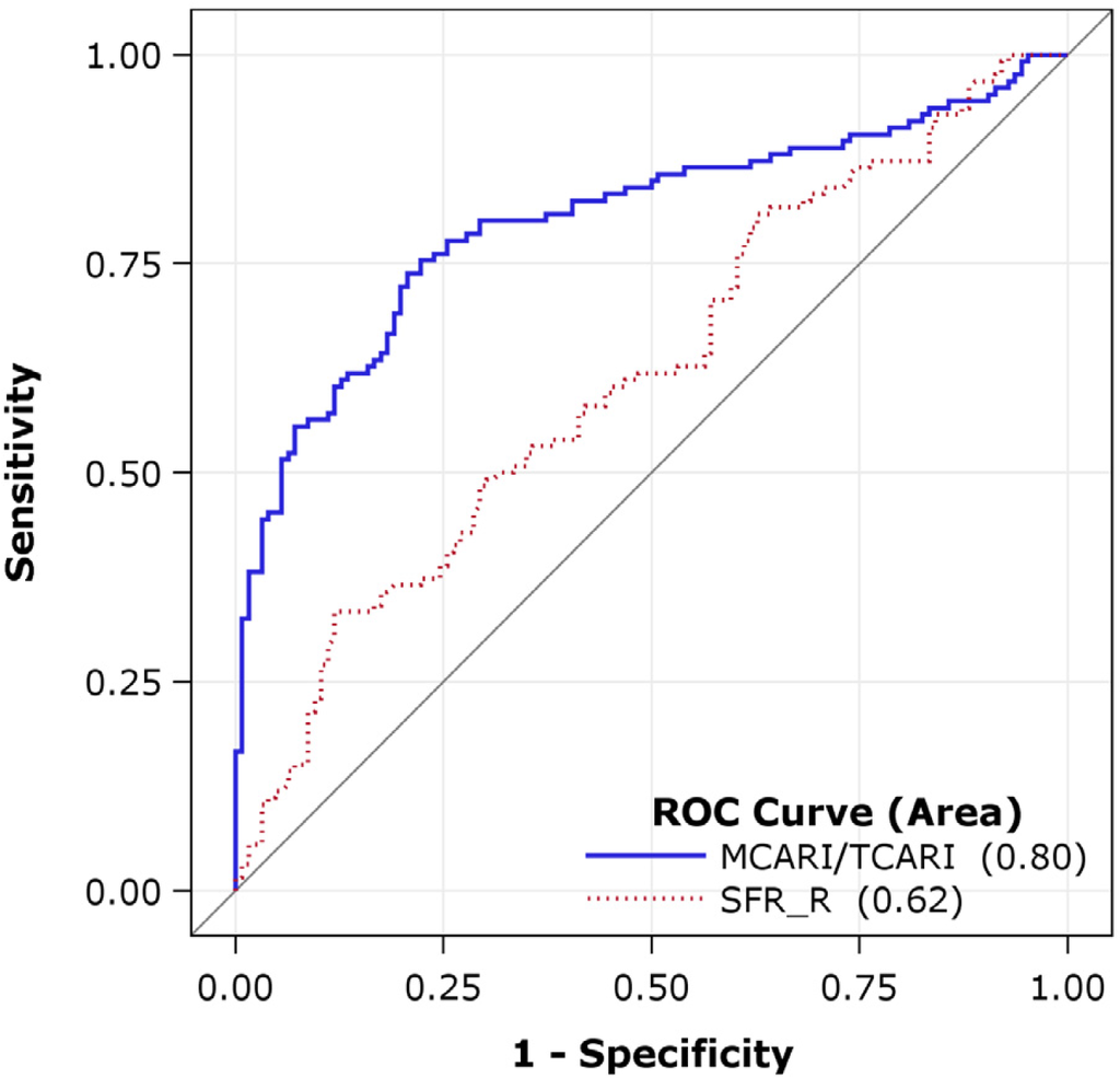ROC plot shows the performances of MCARI/TCARI and SFR_R for the discriminating between the with- and without-fungicide treatments at the second sampling date (DAS 83). The area under ROC curves is 0.80 and 0.62 for MCARI/TCARI and SFR_R, respectively.