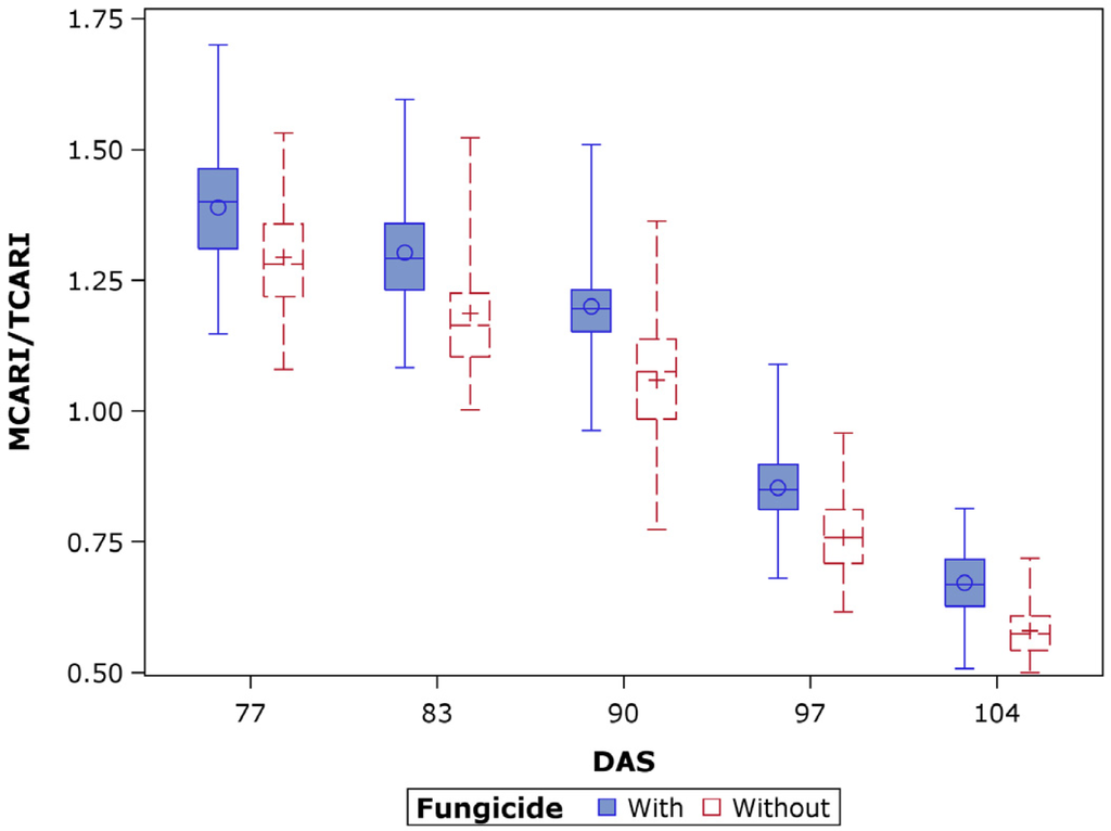 MCARI/TCARI, which is the combination of the Modified Chlorophyll Absorption in Reflectance Index (MCARI) [47] and the Transformed Chlorophyll Absorption in Reflectance Index (TCARI) [48], showed promising performance for discrimination and differentiation between the with- and without-fungicide treatments (Table 5). MCARI was developed for minimizing effects of non-photosynthetic materials [47], based on which TCARI was proposed to counteract the effect of soil background on MCARI [48]. Since diseases affect the absorbed photosynthetically active radiation and thus the radiation use efficiency by leaves, MCARI/TCARI is reasonably expected to detect physiological changes due to diseases, as well as the natural senescence of plant materials. The plants of without-fungicide treatment are also expected to accelerate the senescence process compared to the with-fungicide treatment.