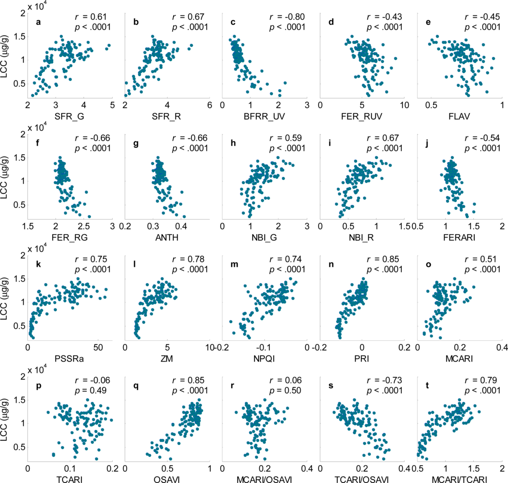 Based on the calibration data, correlation analysis was performed to examine the associations between LCC and the fluorescence and reflectance indices across all sampling dates. As shown in Figure 5, all the fluorescence indices were significantly correlated with the LCC across the sampling dates and varieties (p < 0.0001). The BFRR_UV, SFR_R and NBI_R were the best indices correlating with LCC (Figure 5c,b,i). All reflectance indices were significantly correlated with LCC, with the exception of TCARI (p = 0.49, Figure 5p) and MCARI/OSAVI (p = 0.50, Figure 5r).
