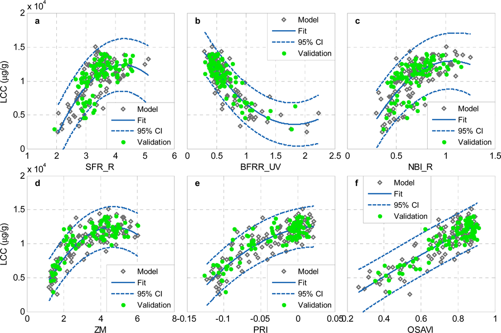 Based on the trend of scatter points, second order polynomial regression was used to fit regression models for the three best fluorescence indices (Figure 6a–c) and three best reflectance indices (Figure 6d–f). The validation data set was used to examine the performance of the six indices in predicting LCC. Table 6 shows the results of the model calibration and validation for each index.