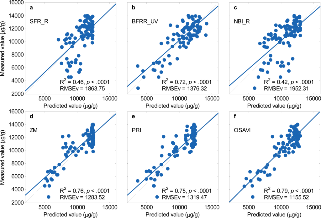 Although fluorescence indices showed acceptable results, SFR_R and NBI_R still failed to account for a large portion (R2 < 0.5) of the variation in LCC (Table 6). Therefore, multivariate regression methods were performed to improve the accuracy in estimating LCC using fluorescence signals.