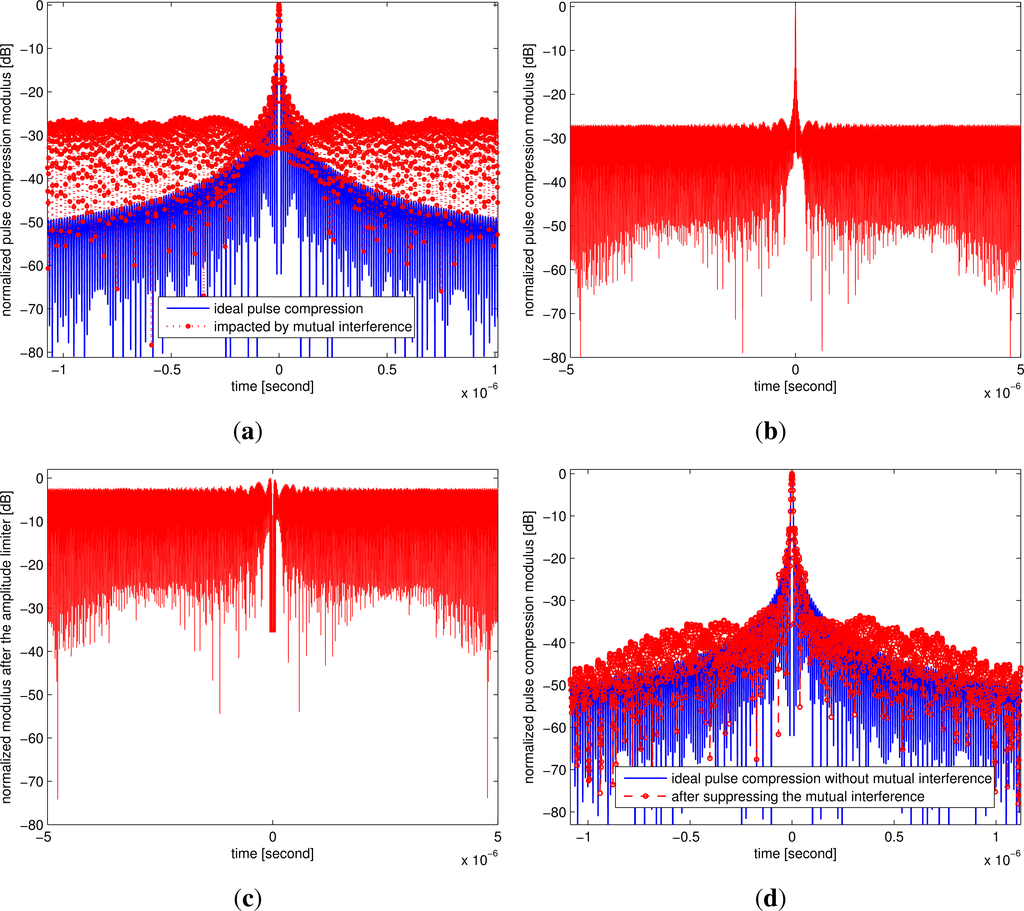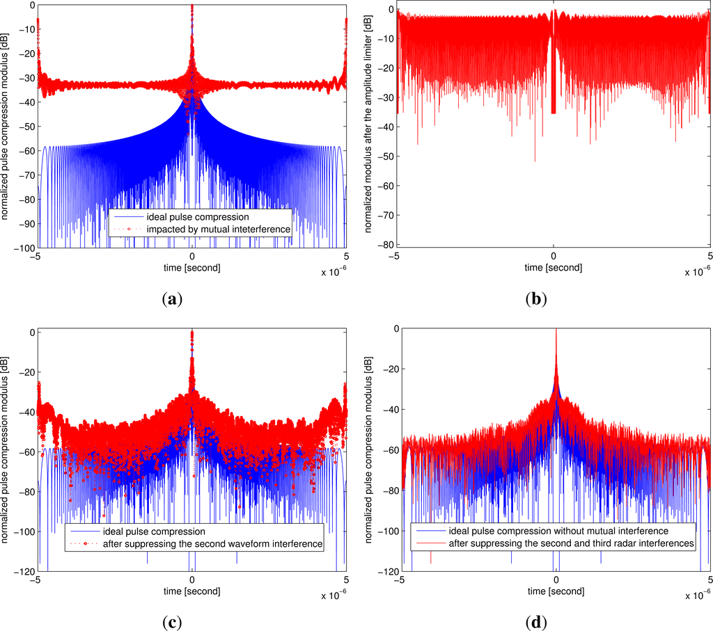 There exists several interference suppression methods that are reported to have good performance [–], but each has some limitations or drawbacks. An intuitive method is to shift the radar carrier frequency to a frequency range that is not contaminated by the radar-to-radar interferences. However, this practice has a problem in that it is usually difficult to find a free band with sufficient bandwidth to operate for distributed radar sensor networks. An interference suppression algorithm was proposed in [] to remove all the signals, except for the interference, similar to switching off the transmitter, for subtraction from the original radar signal. This algorithm has the limitation that the peaks must be separated from, or at least not totally occupied by, the interference. Additionally, several other methods in the time or frequency domain have been proposed to mitigate RF (radio frequency) interference in radar and radio systems, e.g., the time-frequency blanking [], reconstructing and then subtracting [] and range domain orthogonal projection filtering []. Particularly, a multistatic adaptive pulse compression algorithm was proposed in [] to separate concurrently received radar signals within the same frequency band given the knowledge of the individual radar waveforms. This algorithm is based on a recursive implementation of a minimum mean-square error formulation. An adaptive receive filter is estimated for each resolution cell of each received radar signal by utilizing the estimated values of the contemporaneous resolution cells. Although these methods work well for sinusoidal interferences, they are not suitable for dealing with wideband or nonstationary interferences, particularly wideband radar-to-radar interferences that typically occur in distributed radar sensor networks.