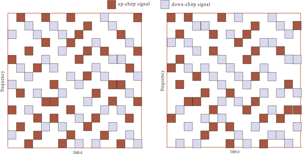 Orthogonal frequency division multiplexing (OFDM) is also a popular choice for distributed radar sensor networks, because OFDM offers advantages, such as robustness against multipath fading and relatively simple synchronization processing. OFDM-like waveforms have been shown to be suitable for radar applications [,] and the feasibility of integrating communication functions in radar networks have also been explored in []. It has been proven in [] that OFDM-coded radar waveforms are comparable with linearly frequency modulation (LFM) waveforms and, furthermore, experience no range-Doppler coupling. Therefore, we simulated the mutual interference suppression algorithm for two radars using the OFDM chirp diverse waveforms designed in []. As shown in Figure 9, the two OFDM chirp diverse waveforms have the following parameters: 16 subcarriers, 16 chips; the subcarrier bandwidth is 10 MHz, and the chip duration is 1 μs.