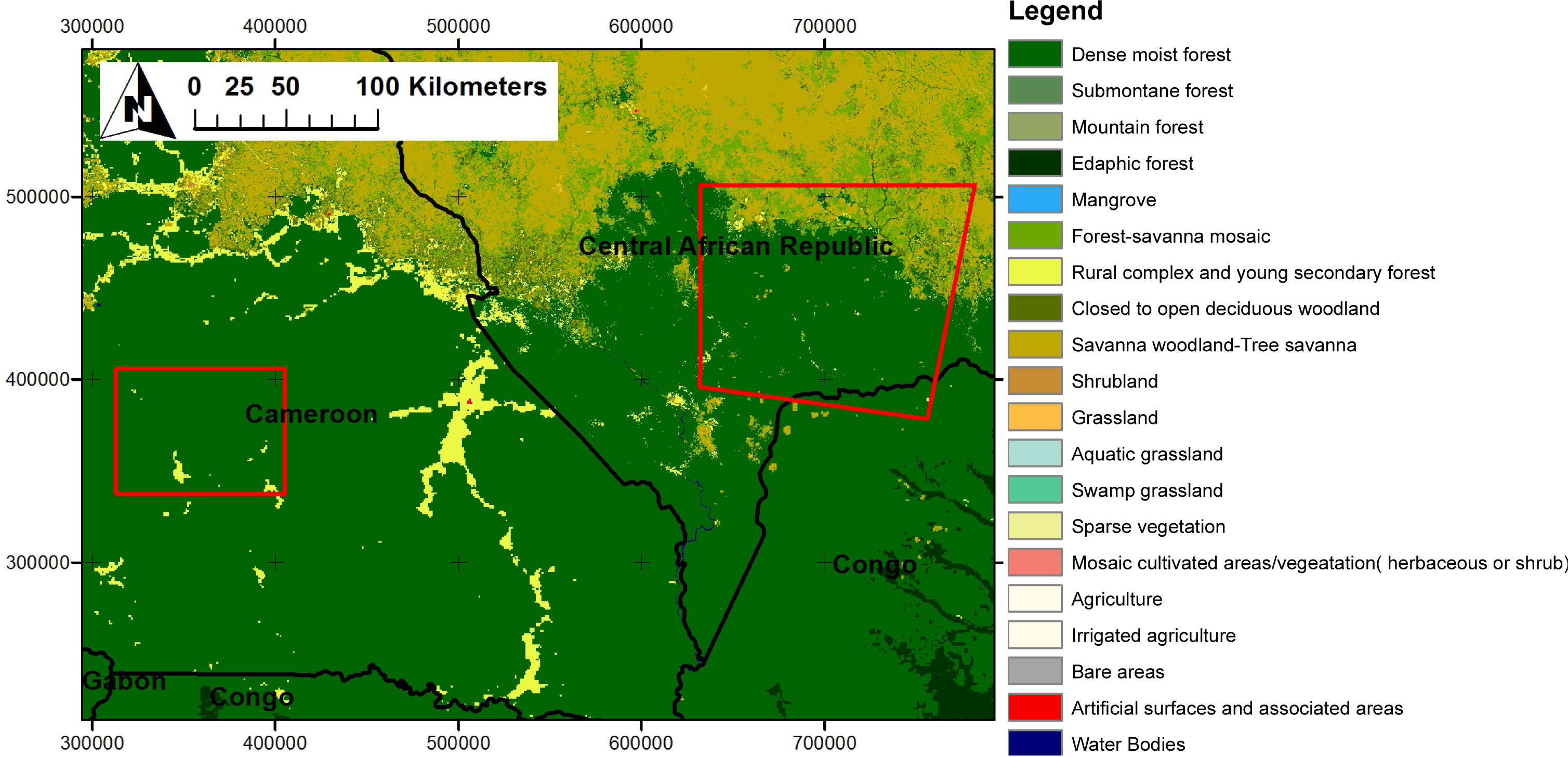 Location of the two study sites in Cameroon and Central African Republic with a Congo Basin vegetation types map as background [40]. The areas marked in red represent the study sites.