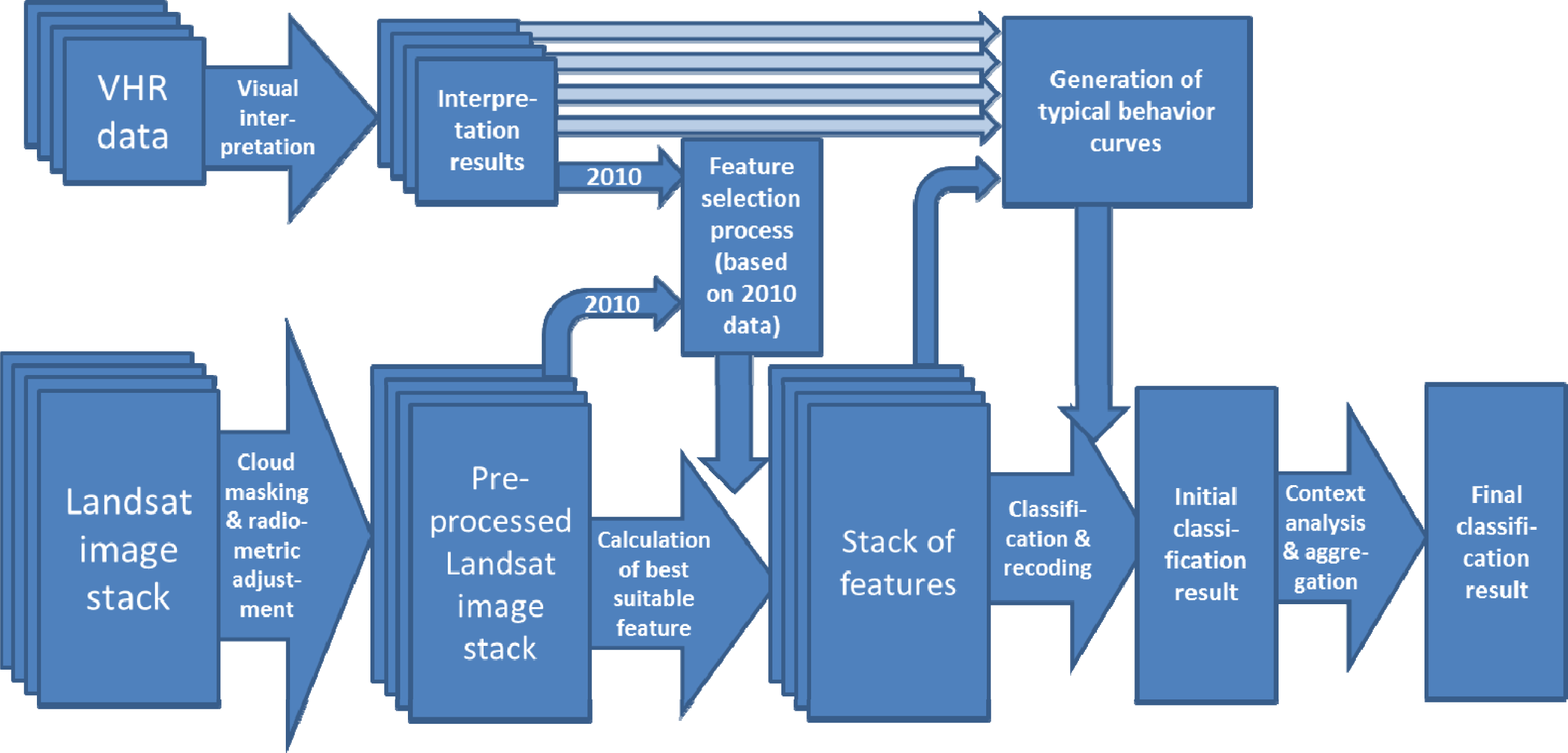 Necessary pre-processing steps include geometric and radiometric adjustment. Clearly, both geometric and radiometric congruence are needed if the spectral behavior over time is to be analyzed. In this study, only Landsat data is used to build the time series; therefore, no geometric adjustment was necessary between the Landsat scenes, as these data sets are already well-registered. However, in order to analyze the suitability of different features in comparison with ground truth data obtained from VHR data, an adjustment of the VHR images to the Landsat data was performed. This was done using tie points and an affine transformation. For radiometric calibration of all multi-temporal Landsat images, one image of the stack was selected as the master image. This master image should have the following properties: (1) free of haze; (2) mostly cloud-free; (3) and, in terms of image acquisition, close to the VHR image (if available). In Table 1, the master image for each of the study sites is printed in bold. All other images were adjusted relative to this master image using the radiometric adjustment procedure developed in the GSE FM REDD (GMES (Global Monitoring for the Environment and Security) Service Element on Forest Monitoring for REDD) project [41]. The method is based on pseudo-invariant features (PIFs); the details can be found in [42].