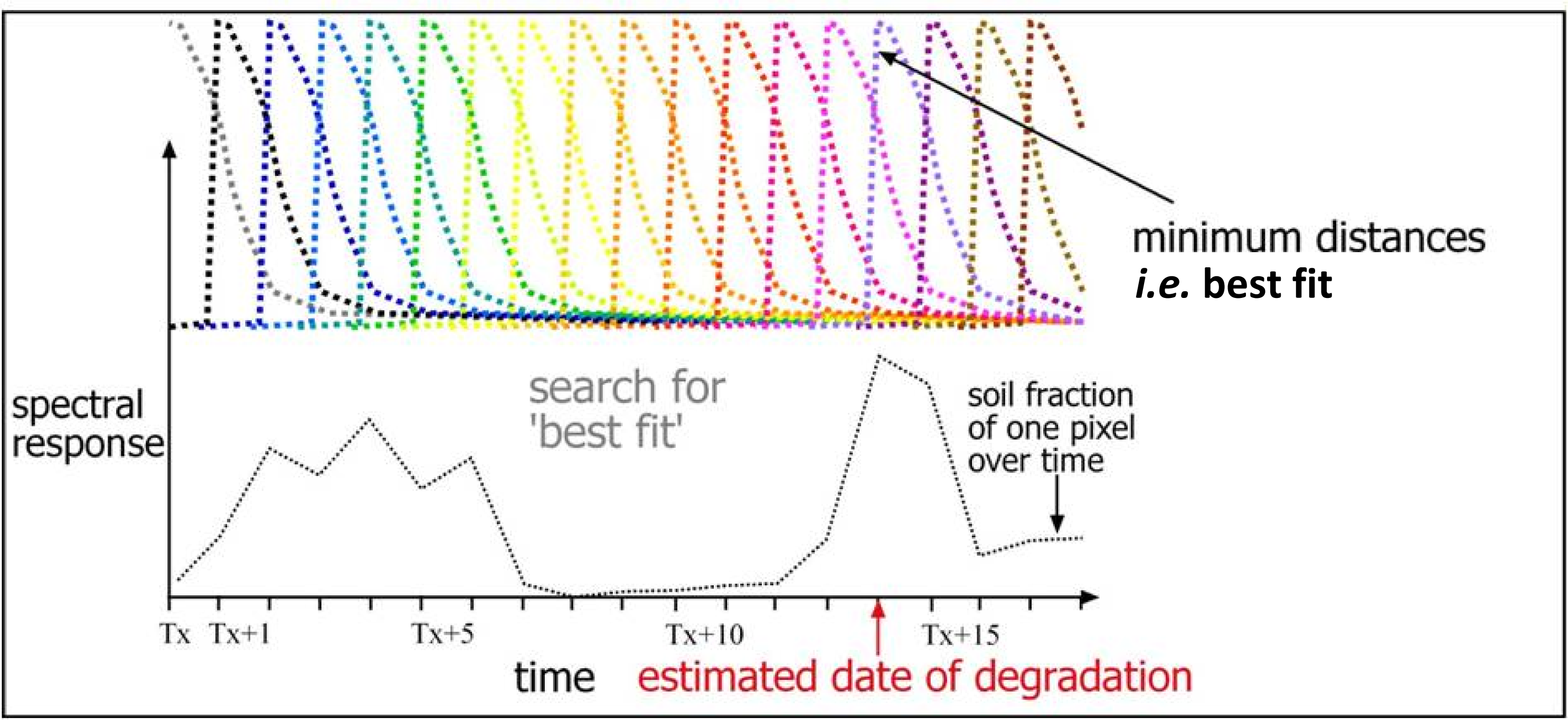 Schematically classification system for the multi-temporal stack of features (e.g., soil fraction). The soil fraction behavior of one example pixel (bottom: black line) is compared to typical behavior of degraded areas (top: colored lines) and classified to the best fitting line.