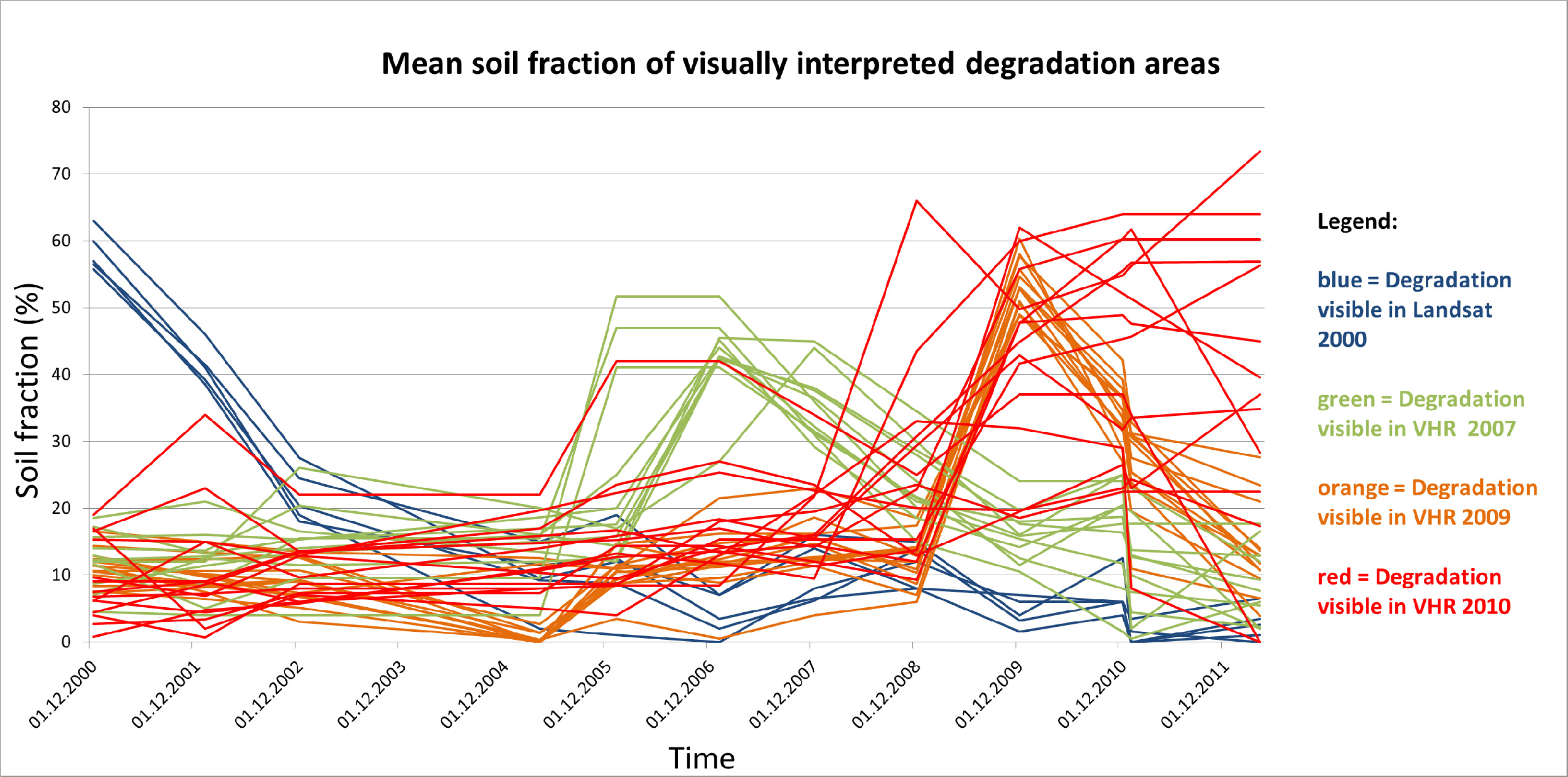 In the Cameroon study site, with its smaller structured degradation patterns, the soil fraction signals are not as persistent over time as has been observed in RoC. Using the three VHR reference data sets together, complemented by the degradation areas selected from Landsat data in the very beginning of the time series, it can be seen that the elevated soil fraction is only visible for about two years in the Landsat time series (Figure 5). After that, the signal becomes blurred and reliable classification does not seem possible anymore, based solely on the soil fraction image (see Figure 5). Similar time frames have already been found in many studies in Latin America [43,44].
