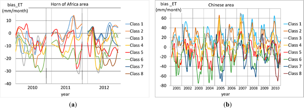 For all classes, the magnitude of the biases in the African region is relatively modest compared to the ones found in the region of China. As a reference, we provide the average monthly ETactual in both regions for the year 2010 obtained from the GLDAS–ET data set. The value was computed over all land pixels shown in Figure 1. The average monthly ETactual ranged from 25–60 mm/month and from 25–120 mm/month in the African and Chinese regions respectively. These differences can partly explain the magnitude of the amplitudes found in the bias curves.