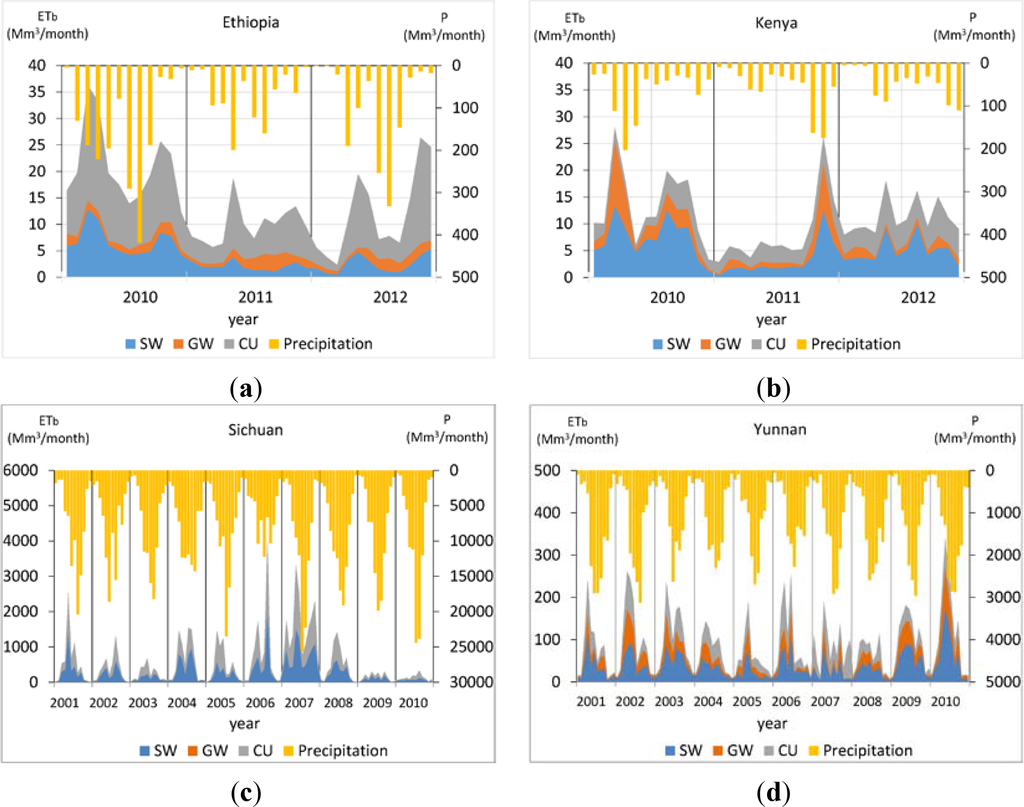 This section contains preliminary results of the application of the ETb method in the study areas. Monthly ETb was calculated for the Horn of Africa for the period 2010 till 2012 and for the Southwest of China for the years 2001–2010. Monthly ETb values were extracted from the pixels labeled by GIAM as irrigated and assigned to the corresponding source of irrigation (SW, GW, CU). Pixel values were converted to volumes (Mm3/month) by using the pixel area and then aggregated per country/province. Figure 3 shows the first results in the study areas where the monthly values of precipitation aggregated over the evaluated pixels are also included.