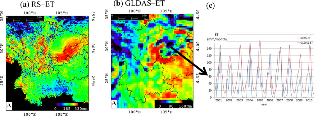 In order to better interpret the results obtained, Figure 4 shows the input RS–ET and GLDAS–ET values in August 2006, where a peak of ETb is found in Sichuan. In this study area the range of RS–ET values was double the ones given by the land surface model in GLDAS–ET, with values up to 330 mm/month. In particular, a hot spot was found in Sichuan province near the border with Chongqing province with low values of GLDAS–ET. There is a high density of irrigated agriculture in this area (see Figure 1), so that the aggregated results per province are highly influenced by these values. Figure 4 also includes the temporal series of these two ETactual estimates in a pixel of the hot spot, where the significant decrease of GLDAS–ET outputs in the year 2006 can be observed. Due to the lack of precipitation, the ETactual model outputs given by the land surface model are lower.