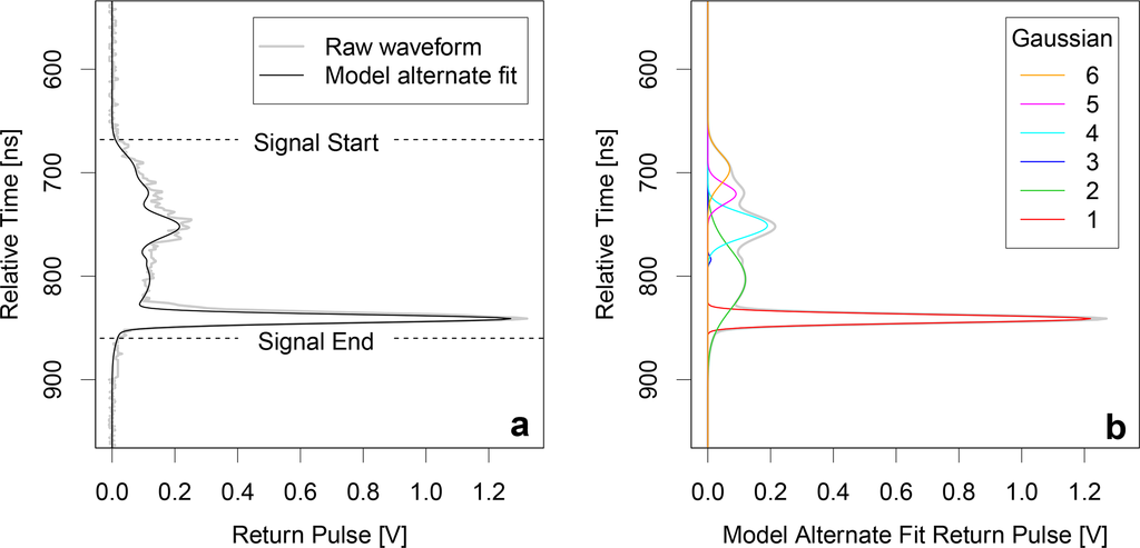 In this study, we use the ICESat/GLAS land data (GLA14) product, release 33 [,]. Whilst in operation (2003–2009), GLAS emitted a Gaussian shaped laser pulse in the 532 and 1064 nm wavebands, approximately 0.75–0.90 m in width (corresponding to a 5–6-ns duration) at the full width half maximum (FWHM). The returned waveform energy profile (in volts, V) is utilised as a proxy to inform of intercepted surfaces, such as vegetation and/or the ground. The returned waveform was measured for a duration equivalent range (i.e., two-way travel) window of 81.6 m (544 ns) for earlier campaigns or 150 m (1000 ns) for later campaigns at 0.15-m (0.5 ns) intervals; the capture duration is expressed relative to a reference range time from the spacecraft []. GLAS was the first spaceborne waveform LiDAR instrument designed to offer almost continuous, near global coverage between ±86° latitude []. However, technical difficulties dictated that data were collected intermittently for its operational lifetime. This consisted of typically 2–3 periods of approximately one month-long data acquisitions per year [,], known as laser campaigns. GLAS footprints are variable size ellipses, with average dimensions (minor and major axes) of 52 m × 95 m for campaigns L1–L2 C and 47 m × 61 m for other campaigns, equivalent to an average circular diameter of approximately 64 m []. The returned waveforms contain various peaks according to intercepted surfaces and are fitted with up to six Gaussians (Figure 1) as described by Duong et al. [], the sum of which define the “model alternate fit” return pulse. Note, not all waveforms exhibit such distinct ground returns, as in Figure 1 [,,], which can infer difficulties in identifying the ground from waveform return profiles.