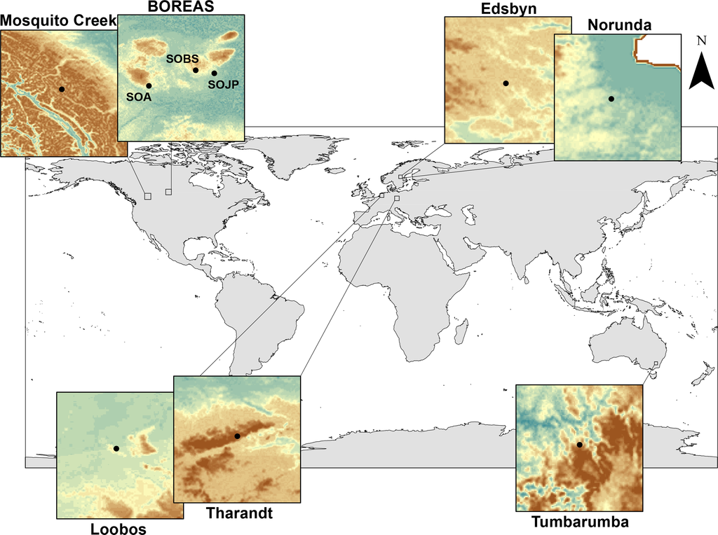 Three of the four Canadian sites are of the former southern BOREAS (Boreal Ecosystem–Atmosphere Study) study sites in Saskatchewan (CA); these exhibit a flat topography with relatively homogeneous (land-cover types) forested areas of Trembling aspen (SOA), black spruce (SOBS) and jack pine (SOJP) stands [,]. Airborne LiDAR data were collected and processed by the authors in August, 2008. Data at Mosquito Creek (MC), near Banff (CA), a mountainous region with a mean elevation of 2500 m a.s.l, were collected and processed by the authors in August 2011. Site topography is relatively complex with localised karst surface features, where forest coverage (20%) is generally restricted to valleys below 2100 m []. The European boreal site of Norunda (NR), near Uppsala, Sweden (S), exhibits a relatively homogeneous forest with flat topography and a high boulder presence, inducing greater terrain roughness [,]. Airborne LiDAR data were collected and processed by the authors in June 2011. The second Swedish boreal site near Edsbyn (ED) exhibits a relatively homogeneous forest with moderate topography and scattered wetlands throughout; here, airborne LiDAR data were processed and provided by Lantm¨ateriet (the Swedish land survey) as part of the Swedish national LiDAR dataset. At Loobos (LB), near Apeldoorn, the Netherlands (NL), the topography is generally flat with some local undulation and open areas throughout the forest []. At Tharandt (T), near Dresden, Germany (D), a relatively dense, multi-layered heterogeneous forest stand is situated on undulating terrain []. Data from these two sites were collected and processed by the authors in June 2010. The Australian (AUS) site is located near the Tumbarumba (TM) research station within the Bago State Forest, New South Wales, exhibiting a quite open canopy with relatively complex terrain []. Airborne LiDAR data were collected and processed by the authors during November 2009. Airborne LiDAR survey information is summarised in Table 2 and study site characteristics in Table 3. Study site geographic locations and terrain information are illustrated in Figure 2.