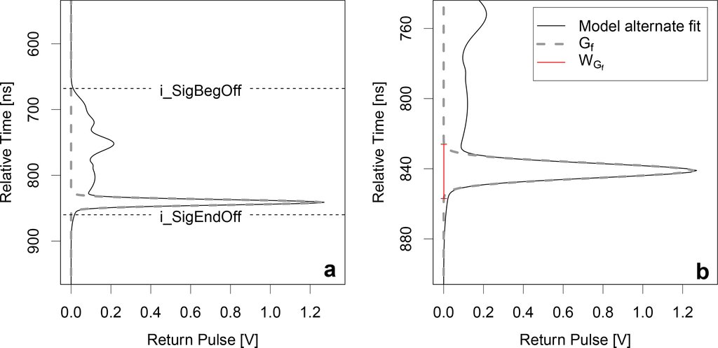 Below, we derive the independent slope model (referred to as ISM throughout) and test it on GLAS waveforms. We use the GLAS model alternate fit return waveform, derived from the GLA14 Gaussian parameters (i_gpCntRngOff; see Figure 1), to infer slope. Estimating slope requires the accurate identification of the waveform ground return. In the case of GLAS, this is defined as the least elevated peak (greatest range) in the waveform profile between the i_SigBegOff (signal start) and i_SigEndOff (signal end) GLA14 elevation parameters (defined as the waveform extent; Figure 3a). We only analyse waveforms whose ground return maximum amplitude exceeds an imposed threshold of ≥ 0.2V. This threshold provided the best distinction (empirically) between returns representing ground only and mixed signal returns from ground and vegetation. A single Gaussian (Gf; Figure 3a) is fitted to the isolated waveform ground return, ensuring a single Gaussian representation, implemented to provide consistency in ground return shape. Ground return shape can be skewed, particularly when it represents mixed signal returns (as described above) and/or consists of multiple Gaussian fits.