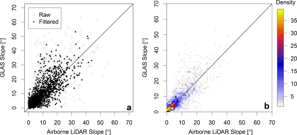 Figure 5a illustrates a comparison of ALS and ISM slopes for raw and filtered (according to Section 3.1.2) data; Figure 5b illustrates filtered data only, indicating the density of points per coloured pixel. Results suggest that the highest density of points occur near the 1:1 line (marked in both figures), up to an approximate maximum slope of 40°. Here, data filtering removed approximately 15% of all waveforms, and it is possible that some spurious data still remain in the current selection. Adjusting the acceptance threshold beyond R2 = 0.9 (see Section 3.1.2) will remove a larger proportion of spurious data, but this will be at the cost of removing too many reliable data.