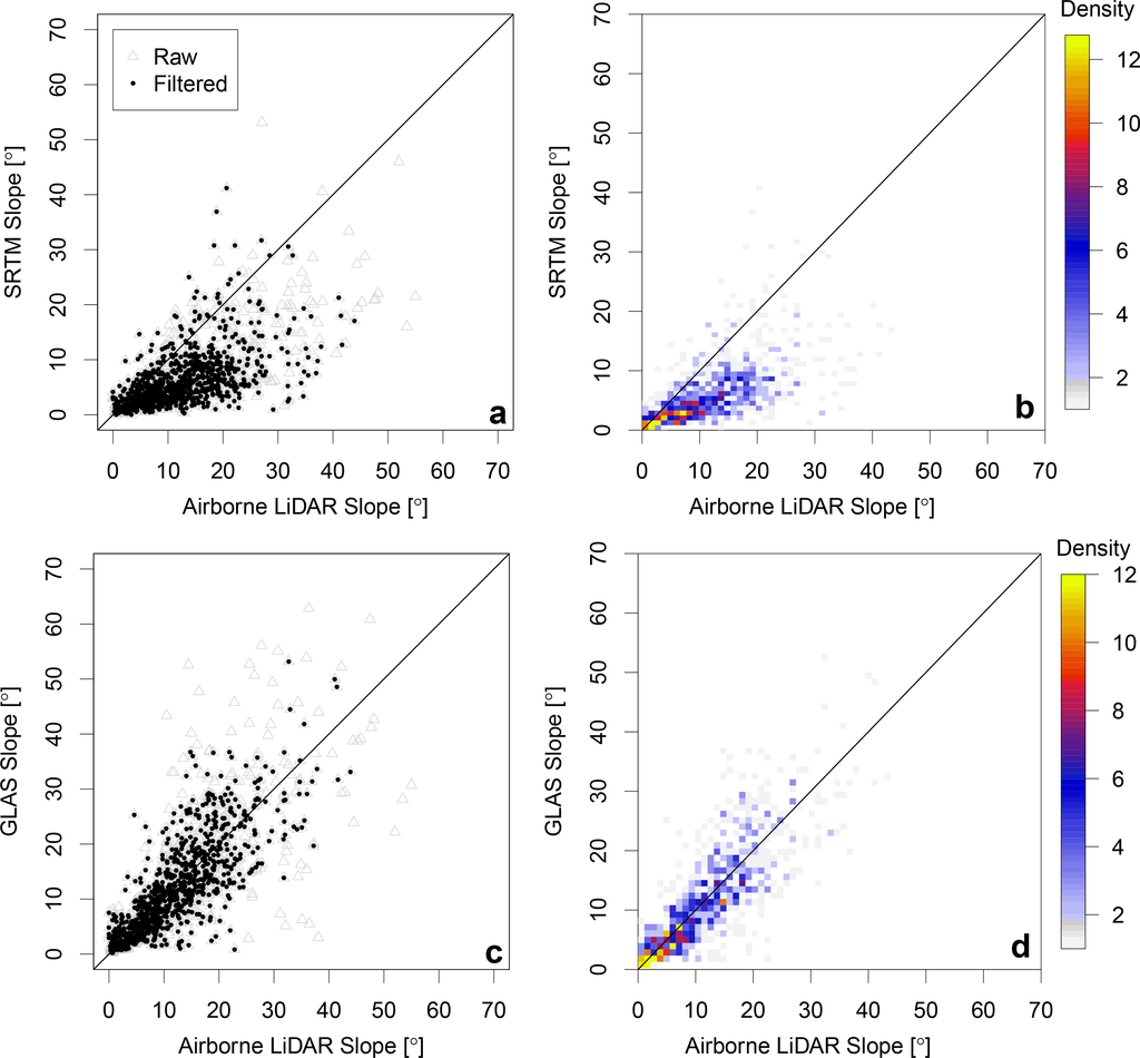 Figure 6a,b and Figure 6c,d illustrate the same as Figure 5a,b, but for ISM and SRTM and a corresponding subset of ISM and ALS data, respectively. It is highlighted that SRTM-derived slopes tend to underestimate ALS equivalents, an effect that becomes more prominent with increasing slope.